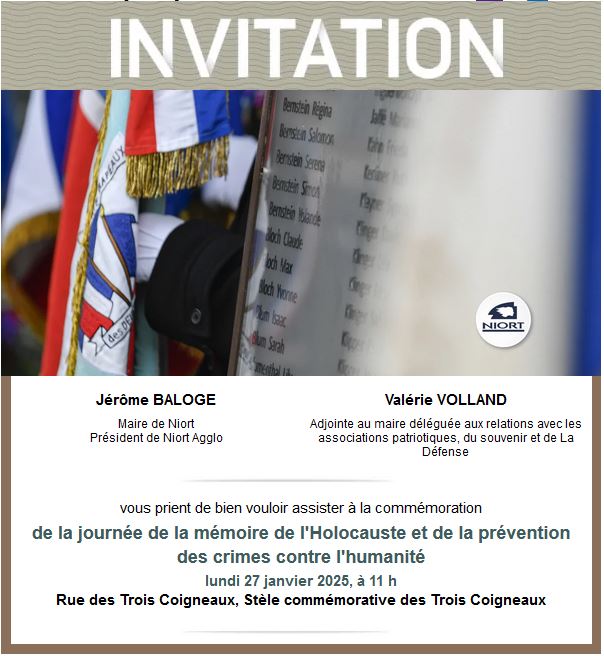 Cérémonie à Niort le lundi 27 janvier 2025 à 11h00, Stèle située rue des Trois Coigneaux.