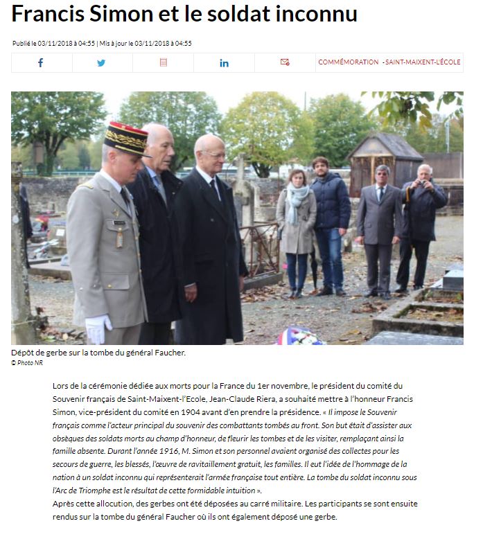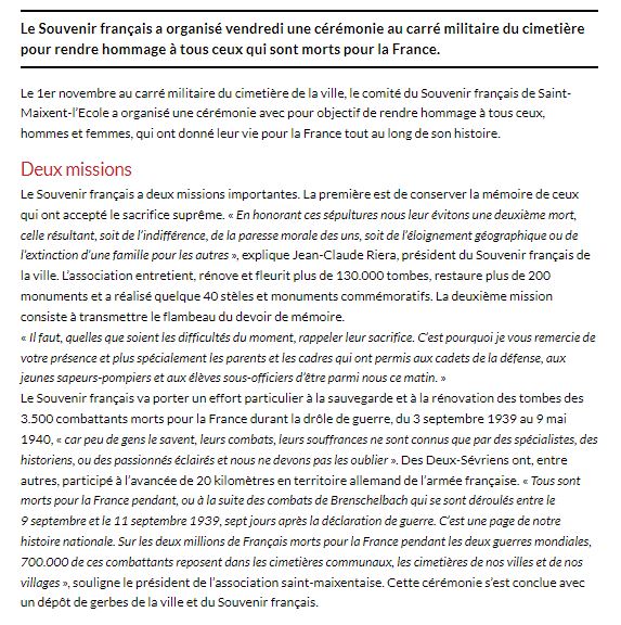 Dans la ville de Saint-Maixent-l’École, où sont installés de nombreux anciens combattants, toutes les commémorations sont très suivies. Initiée par le Souvenir français que préside Jean-Claude Riera, la cérémonie du souvenir du 1er novembre a eu lieu au cimetière ancien avec seulement un porte-drapeau, le maire Stéphane Baudry, le représentant du général commandant l’Ensoa, le capitaine Stéphane, et Jean-Luc Drapeau représentant la Députée Delphine Batho. Jean-Claude Riera a indiqué : « Nous sommes bien dans un moment exceptionnel pour célébrer cette commémoration ».