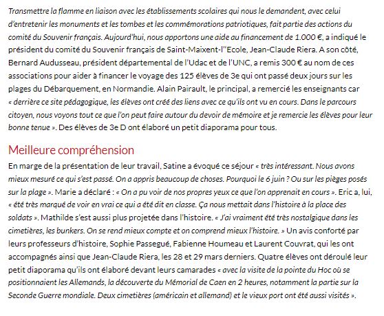« L’une des missions du Souvenir français est d’envoyer tous les collégiens dans les endroits mémoriels comme Verdun, la Normandie ou encore Oradour. Notre rôle est donc d’aider financièrement les établissements qui en font la demande. Nous intervenons également auprès des Cadets de la défense à Saint-Maixent-l’École, au musée militaire ou lors du Service national universel », a expliqué Jean-Claude Riera.