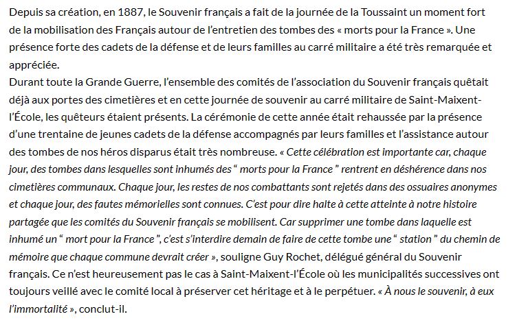 « Notre association a fait de la Toussaint un moment fort de la mobilisation des Français autour de l’entretien des tombes des Morts pour la France. Même pendant la Grande Guerre, l’ensemble des comités du Souvenir français quêtait aussi aux portes des cimetières. Au début du XXe siècle, le Souvenir français a imposé que le 31 octobre et le 1er novembre soient consacrés à rendre hommage aux combattants morts pour la liberté et la démocratie. En 1919, le législateur a donné une base légale à la commémoration de ces deux journées avec la quête à la sortie des cimetières qui sert à l’entretien des tombes de ceux qui sont morts pour la France. »
