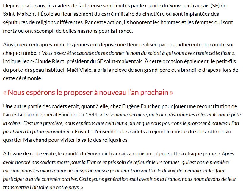 Au cours de ces mois, le Souvenir français, par l’intermédiaire des membres du comité de Saint-Maixent-l’École, leur fait connaître et appliquer ses trois missions fondamentales de l’association : honorer les personnes décédées au service de la France, participer à la vie commémorative, transmettre la flamme du devoir de mémoire.