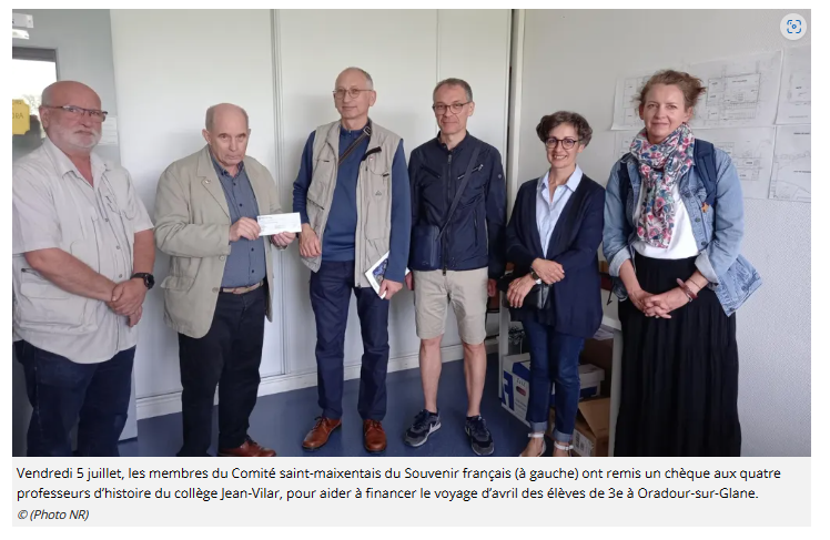 Vendredi 5 juillet, les professeurs d’histoire du collège Jean-Vilar, Mmes Bober et Mouzin et MM. Larcher et Marteau, ont reçu un chèque de 500 € remis par Jean-Claude Riera, du Comité saint-maixentais du Souvenir français, pour financer une partie de ce voyage.
