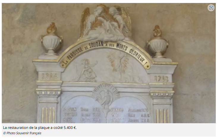 Dans le cadre des travaux de finition de la restauration intérieure et du mobilier de l’église, décidés et conduits par la municipalité de Soudan, le comité du Souvenir français de Saint-Maixent-l’École a participé au financement de la restauration de la plaque portant les noms des enfants de la commune tombés durant la Première guerre mondiale.